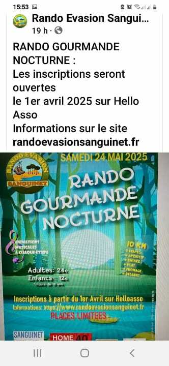 Comme toutes les années, nous participons à la RANDO NOCTURNE ET GOURMANDE DE SANGUINET. Le nombre étant lmimité à 1000 personnes, nous vous recommandons de prévoir votre inscription En LIGNE dès le 1er avril.